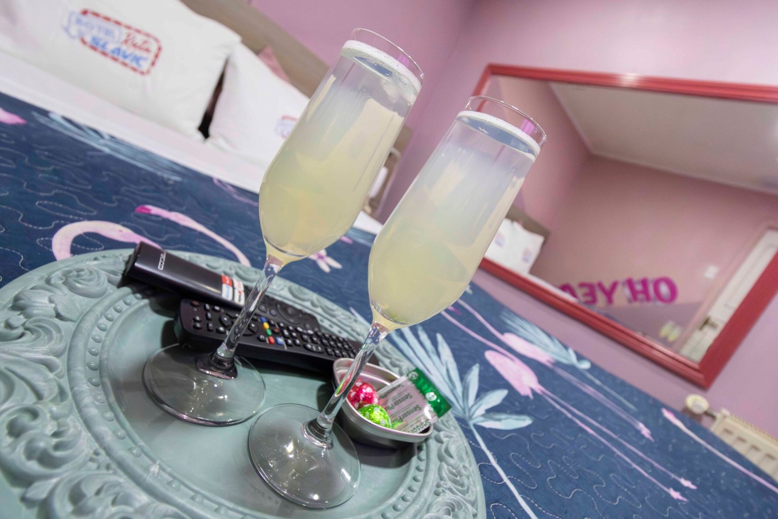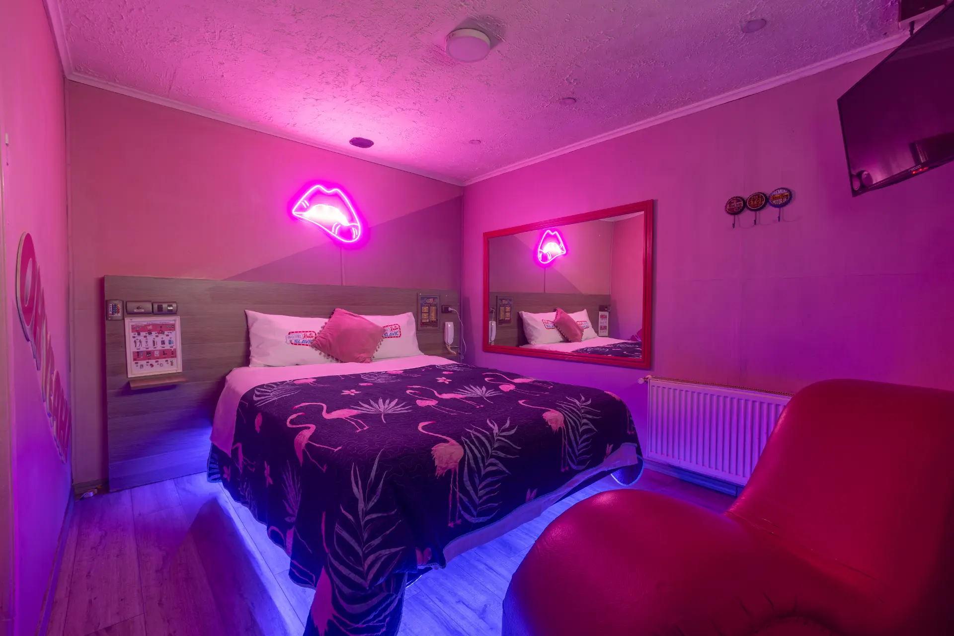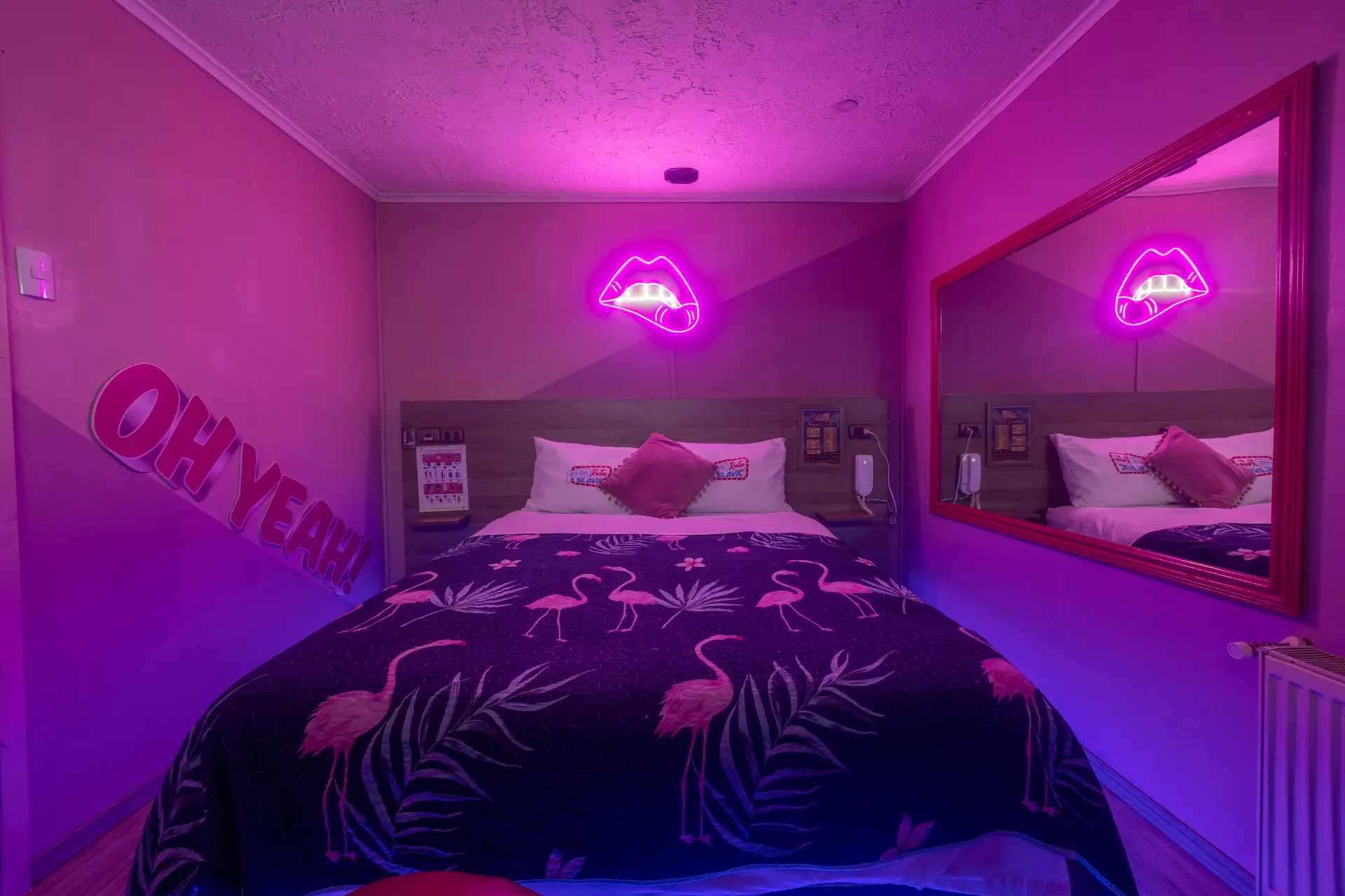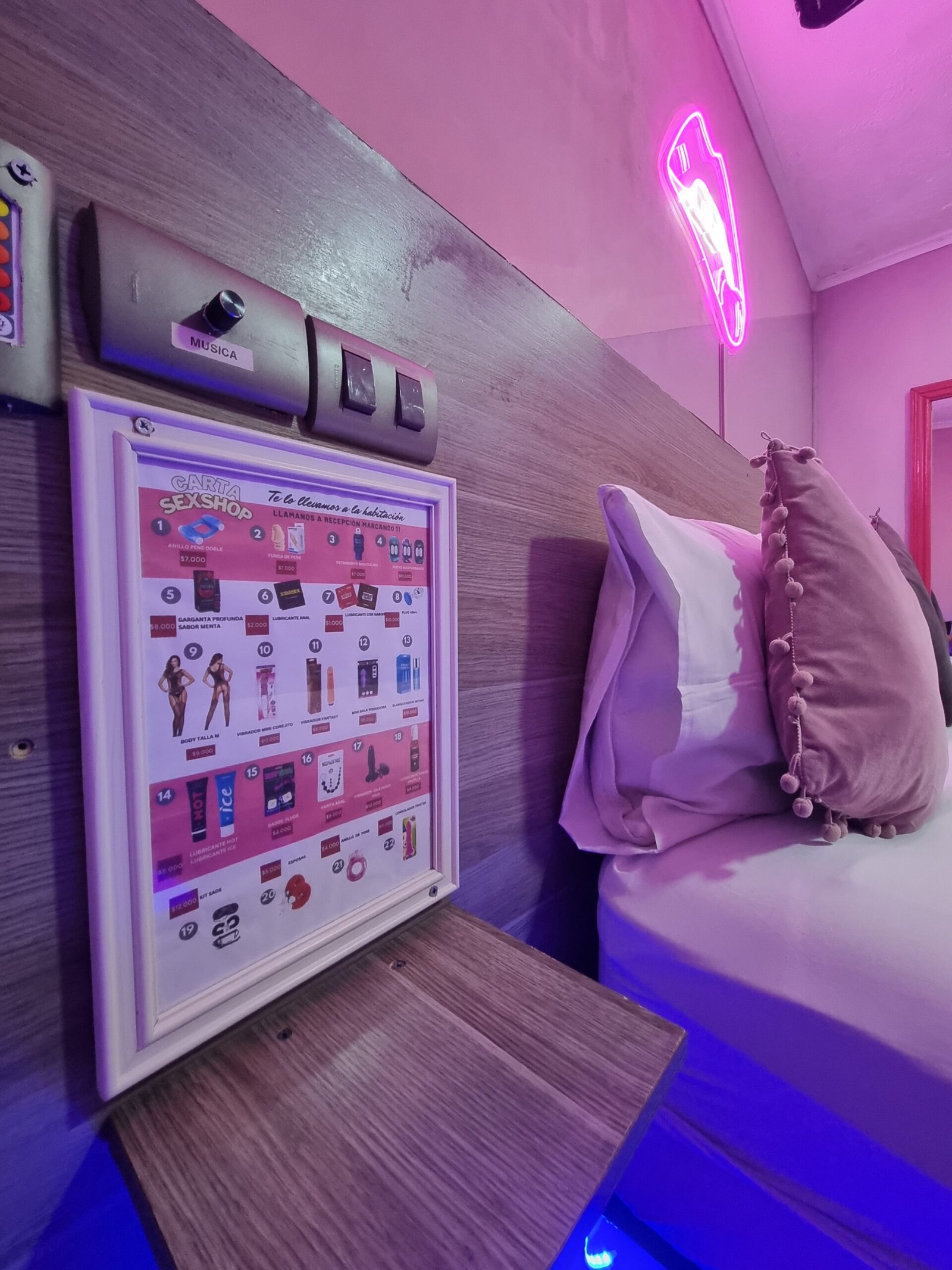 «Si te gusta dejar marcas, en esta pieza podras morder a tu antojo. Todo en rosa, todo encendido. Acá no se viene a dormir… se viene a jugar con ganas. Y sí, la cama aguanta.»
